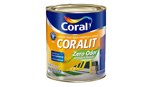 Esmalte Coralit Zero não amarela em ambientes internos e externos, e possui 10 anos de durabilidade. Sua nova fórmula agora é sem cheiro, permite pintar e fechar portas e janelas, sem ficar com cheiro de tinta. Secagem mais rápida. A diluição e limpeza das ferramentas pode ser com água, dispensa o agarrás. Baixa toxicidade.