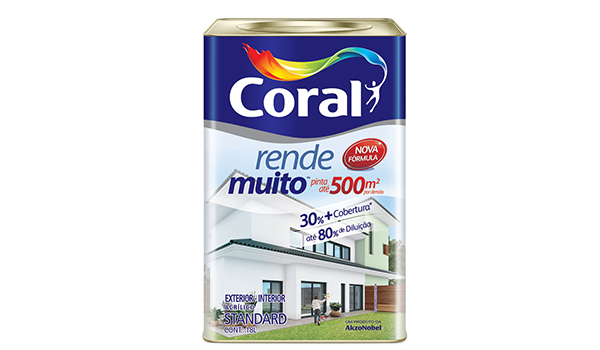 Coral Rende Muito é uma tinta de alta consistência que permite uma diluição superior aos produtos convencionais. Você consegue 80% de diluição com água, podendo pintar até 500m² (lata) por demão. ÿ muito mais rendimento com uma excelente cobertura e o melhor custo benefício. O Rende Muito é um produto inovador e se apresenta como uma solução muito mais sustentável que as outras tintas, pois com uma lata de Rende Muito você tem quase duas latas de tinta.